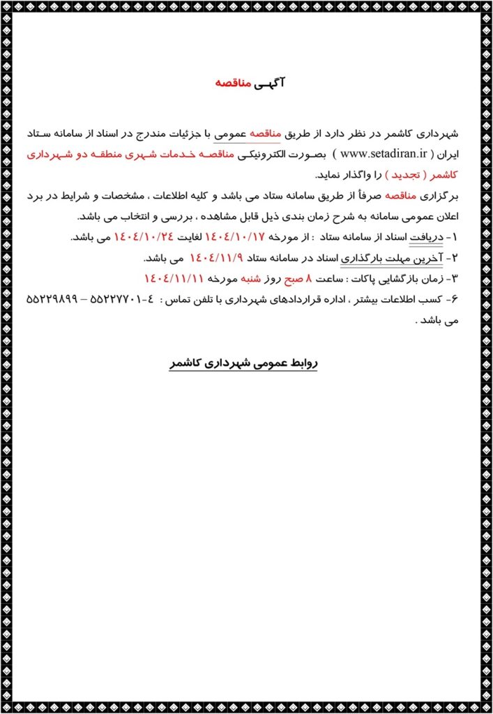 آگهی مناقصه خدمات شهری منطقه دو شهرداری کاشمر(تجدید)