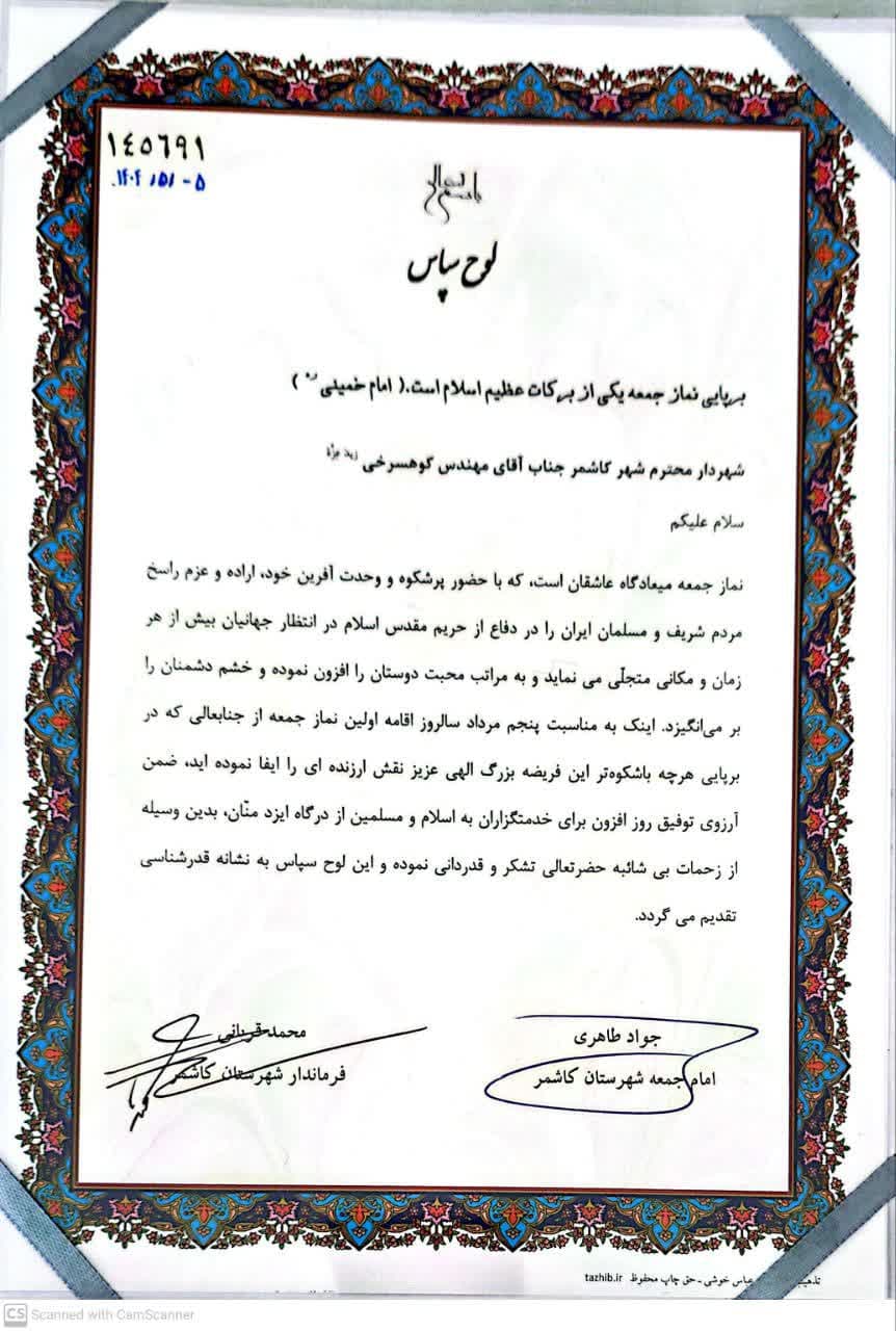 تقدیر وتشکرباحضوررئیس محترم شورای سیاستگذاری ائمه جمعه استان خراسان رضوي جناب حجه الاسلام والمسلمین حاج آقای ایزدی از شهردار محترم کاشمر آقای مهندس کوهسرخی توسط امام جمعه محترم شهرستان وفرماندار شهرستان