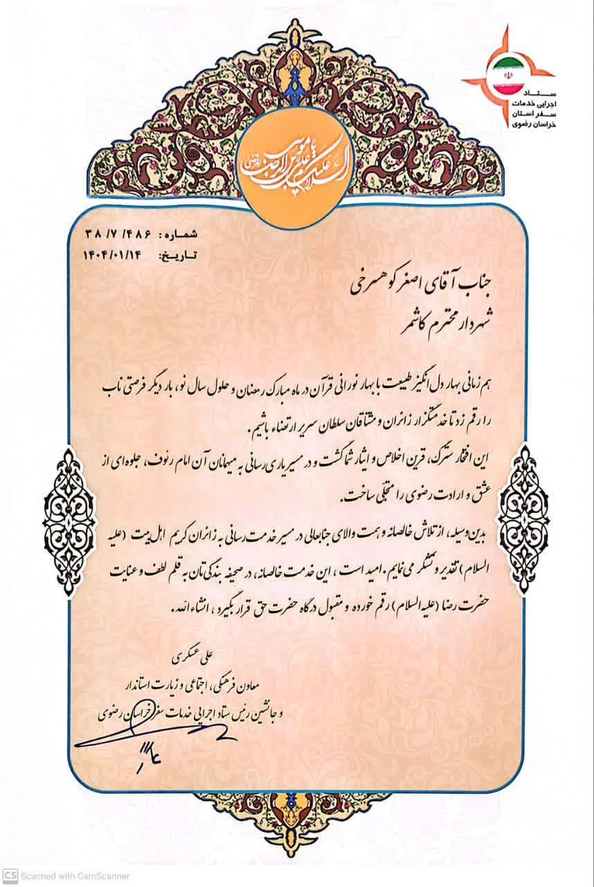 تقدیر وتشکر معاون محترم فرهنگی ،اجتماعی وزیارت استاندار وجانشین رئیس ستاداجرایی خدمات سفر خراسان رضوی جناب حجه الاسلام والمسلمین حاج آقای عسگری از شهردار محترم کاشمر جناب آقای مهندس کوهسرخی